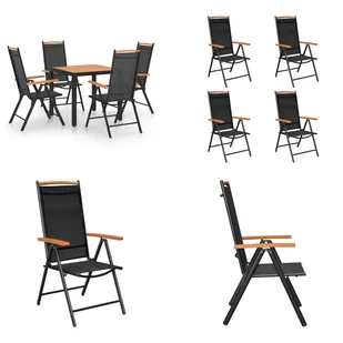 5-częściowy ogrodowy zestaw jadalniany aluminiowo-czarnyTen praktyczny, a zarazem stylowy zestaw ogrodowy jest idealny do relaksu lub spożywania posiłków w ogrodzie lub na patio. Malowana proszkowo aluminiowa rama sprawia, że zestaw mebli jest bardzo solidny i trwały. Krzesła ogrodowe są wyposażone w miękkie siedziska i oparcia, które można regulować w 7 pozycjach, dzięki czemu zawsze można cieszyć się najwygodniejszą pozycją siedzącą. Podłokietniki i górna listwa nadają krzesłom stylowy wygląd. Krzesła z wysokim oparciem można złożyć, aby zaoszczędzić miejsce, gdy nie są używane.
