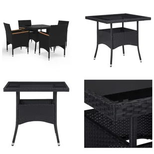 5-częściowy ogrodowy zestaw jadalniany z czarnego polirattanu i drewna akacjowegoCiesz się świętowaniem przy tym 5-częściowym zestawie do jadalni! Dzięki temu zestawowi mebli możesz z łatwością zaspokoić wszystkie potrzeby swoich gości, tworząc jednocześnie idealne miejsce do spożywania posiłków na świeżym powietrzu!Ten zestaw jadalniany ma wzmocnioną stalową ramę pokrytą stylowym, odpornym na warunki atmosferyczne, ręcznie tkanym rattanem PE. Oznacza to, że zestaw mebli może być przez cały rok. Blat stołu z hartowanego szkła tworzy gładką i łatwą do czyszczenia powierzchnię. Podłokietniki wykonane są z wysokiej jakości drewna akacjowego, tropikalnego drewna twardego, które jest odporne na warunki atmosferyczne i trwałe. Kunszt wykonania i piękne usłojenie drewna sprawiają, że każdy mebel jest wyjątkowy.