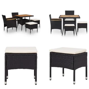 5-częściowy ogrodowy zestaw jadalniany z czarnego polirattanu i litego drewna akacjowegoStwórz atrakcyjną i spójną estetykę i ciesz się niezapomnianymi posiłkami na świeżym powietrzu dzięki temu 5-częściowemu ogrodowemu zestawowi do jadalni! W komplecie z 1 stołem, 2 fotelami i 2 stołkami, zestaw ten jest idealny do ogrodu lub patio!Ten zestaw jadalniany ma wzmocnioną stalową ramę, która jest pokryta stylowym, odpornym na warunki atmosferyczne, ręcznie tkanym rattanem PE. Oznacza to, że zestaw mebli może być przez cały rok. Blat stołu i podłokietniki wykonane są z litego drewna akacjowego, tropikalnego drewna twardego, które jest odporne na warunki atmosferyczne i trwałe. Kunszt wykonania i piękne usłojenie drewna sprawiają, że każdy mebel jest wyjątkowy. Siedzisko jest wyposażone w zdejmowaną, grubo wyściełaną poduszkę zapewniającą dodatkowy komfort.