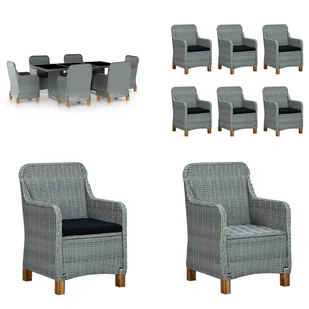 7-częściowy ogrodowy zestaw jadalniany z poduszkami z polirattanu jasnoszaryTen zestaw jadalniany to idealne połączenie stylu i funkcjonalności, które będzie przyciągać wzrok w ogrodzie, na tarasie lub balkonie!Zestaw mebli wykonany jest z lekkiego, łatwego w pielęgnacji, okrągłego rattanu PE i dlatego jest nie tylko idealny do użytku na zewnątrz, ale może być również łatwo czyszczony wilgotną szmatką. Dzięki malowanym proszkowo stalowym ramom fotele i stół są stabilne i trwałe. Solidny blat stołu zapewnia idealne miejsce na różne ważne przedmioty. Grubo wyściełane poduszki zapewniają dodatkowy komfort podczas wypoczynku. Ich poszewki mają zamki błyskawiczne, dzięki czemu można je zdejmować i prać.