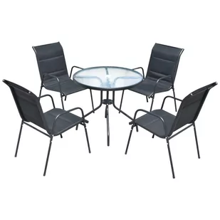 Wygodne krzesła wykonane są z wysokiej jakości stali krytej proszkowo. Dzięki wytrzymałej tkaninie textilene z wodoodpornym podbiciem nasze krzesła są bardzo wygodne, odporne na warunki pogodowe i łatwe w czyszczeniu. Można je ustawiać w stos, aby zaoszczędzić miejsce. Stół wyposażono w blat o grubości 5 mm wykonany z hartowanego, wzorzystego szkła, na którym możesz stawiać szklanki z napojem, przekąski lub przedmioty dekoracyjne. Ma on również ramę z krytej proszkowo stali, która jest bardzo wytrzymała i łatwa w utrzymaniu. Dzięki otworom na parasol: w blacie i poniżej niego, możesz z łatwością zamocować w nim parasol ogrodowy, aby stworzyć nieco cienia w upalne, letnie dni. Montaż jest prosty.
