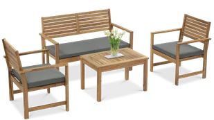 Olejowane drewno oraz zdejmowane poszewki poduszek sprawiają, że zestaw jest prosty w konserwacji i zachowuje estetyczny wygląd przez długi czas. Klasyczny styl zestawu sprawia, że świetnie komponuje się z różnymi aranżacjami przestrzeni zewnętrznych, dodając im uroku i funkcjonalności. Wymiary Sofa: długość - 120 cm, szerokość - 61 cm, wysokość - 81 cm Fotel: długość - 64 cm, szerokość - 61 cm, wysokość - 81 cm Stolik: