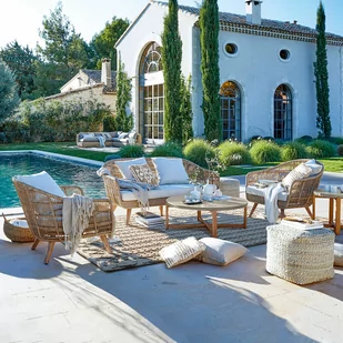 Komfortowe dodatki w cenie: sofa została wyposażona w miękką tapicerowaną poduszkę siedziska i dwie poduszki oparcia, natomiast fotel w poduszkę siedziska i poduszkę oparcia. Wytrzymałe tkane pokrowce są idealne do użytku zewnętrznego, nie blakną i nadają się do prania w pralce. Całości dopełniają solidne nogi z woskowanego drewna akacjowego. Doskonały duet na taras i do ogrodu.