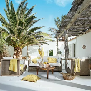 Czarująca, przytulna atmosfera w Twoim domu. Odporność na promieniowanie UV, deszcz i mróz Wykonany z wysokiej jakości technorattanu z miękkimi i wytrzymałymi poduszkami. Prawdziwa atmosfera plaży i morza w Twoim domu. Piękny zestaw mebli wygląda niczym z malowniczego obrazu, na którym widać słońce, piasek i palmy. Bez wątpienia roztoczy on swój morski urok także w ogrodzie lub na tarasie.