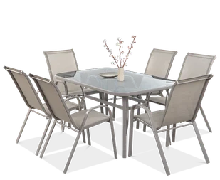 : Zestaw mebli ogrodowych BOLOGNA 150/6 w kolorze Light Beige to idealne rozwiązanie dla osób ceniących komfort i elegancję w ogrodzie, na tarasie czy działce. Nowoczesny komplet składa się z sześciu ergonomicznych krzeseł oraz przestronnego stołu, tworząc doskonałą przestrzeń do relaksu i spotkań na świeżym powietrzu. Solidna konstrukcja zestawu wykonana jest z trwałej stali malowanej proszkowo w odcieniu srebrnym, co zapewnia odporność na warunki atmosferyczne i długowieczność. Krzesła wykończone są wysokiej jakości tkaniną Textilene w nowoczesnym odcieniu Light Beige, która gwarantuje wygodę użytkowania bez potrzeby stosowania dodatkowych poduszek. Praktyczny stół wyposażony jest w elegancki blat z hartowanego szkła dymionego z otworem na parasol, co zwiększa jego funkcjonalność.