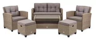 1 x ława z drewnopodobnym blatem 2 x fotel 1 x sofa dwuosobowa 2 x pufa 4 x pojedyncza poduszka ze zdejmowanym pokrowcem 1 x podwójna poduszka ze zdejmowanym pokrowcem 4 x pikowana poduszka na oparcie 1 x zestaw montażowy SPECYFIKACJA: Marka: di Volio Model: Firenze DV-016GF Kolor rattanu: beżowy Kolor poduszek: beżowy Stół o wymiarach: