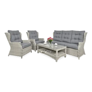 Cechy produktu zestaw przeznaczony jest do użytku zewnętrznego i wewnętrznego w skład kompletu wchodzi funkcjonalna 3-osobowa sofa, 2 duże i wygodne fotele, stolik i poduchy stelaż wykonany jest z aluminium malowanego proszkowo, co zapewnia stabilność i lekkość konstrukcji oraz całkowitą odporność na rdzę do wykończenia użyty został najwyższej jakości technorattan w odcieniu white grey o dodatkowy komfort dbają grube i wygodne poduszki z zamkiem błyskawicznym stolik wyposażony jest w bezpieczną szybę z hartowanego szkła o grubości 5mm całość jest bardzo łatwa do utrzymania w czystości, do pielęgnacji wystarczy tylko wilgotna ściereczka dzięki użyciu materiałów wysokiej jakości (technorattan, aluminium), nasz zestaw oznacza się maksymalną trwałością, odpornością na warunki atmosferyczne i promieniowanie UV rewelacyjny do ogrodu, na taras oraz do wszystkich wnętrz mieszkalnychWymiary stolik: długość - 120 cm, szerokość - 60 cm, wysokość - 45 cm fotel: szerokość - 73 cm, głębokość - 85 cm, wysokość - 100 cm sofa: szerokość - 187 cm, głębokość - 85 cm, wysokość - 100 cm