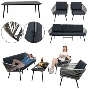 Wymiary podwójnej sofy: Szerokość 182 cm X Głębokość 70 cm X Wysokość 70cm Blat stołu wykonany ze szkła Rama wykoanana ze stali malowanej proszkowo Sznur otaczający ramę wykoanany z materiału PE, w kolorze szarym Poduszki i siedzisko wykonane z poliestru w kolorze ciemno szarym Rama ciemno szara Blat stołu czarny
