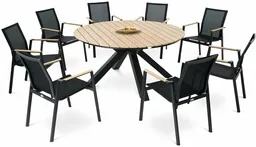 Zestaw Ozzano, marki di volio, to propozycja dla osób poszukujących stylowych, wygodnych i trwałych mebli ogrodowych, dzięki którym przydomowa przestrzeń zewnętrzna zyska praktyczny wymiar i nowe funkcje. Komplet, w skład którego wchodzi duży stół jadalniany oraz osiem krzeseł , sprawdzi się zarówno podczas codziennego relaksu, jak i rodzinnych spotkań i przyjęć w ogrodzie. Okrągły kształt stołu sprzyja swobodnej rozmowie i integracji wszystkich gości, a krzesła wyposażone w podłokietniki oraz ergonomiczne siedziska i oparcia gwarantują komfort nawet podczas długotrwałego użytkowania. Poza funkcjonalnością, meble wyróżnia także trwałość i odporność na działanie warunków atmosferycznych. Dzięki połączeniu aluminiowej konstrukcji, elementów z tworzywa polywood imitującego drewno oraz tkaniny Textilene, meble nie niszczeją pod wpływem wilgoci, promieni UV, ani zmiennych temperatur.