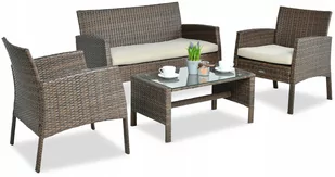 Strukturą przypomina natomiast naturalny materiał, dzięki czemu idealnie komponuje się z zielenią ogrodową. Dzięki stalowemu stelażowi meble są też bardzo stabilne i solidne – bez wątpienia przetrwają długi czas. Ten zestaw mebli ogrodowych to najlepsze rozwiązanie służące do stworzenia uniwersalnego, a zarazem wygodnego kącika ogrodowego na świeżym powietrzu. Bez problemu przetrwa każdą pogodę i zapewni Tobie oraz Twoim gościom pożądany komfort. Cechy: zestaw mebli wypoczynkowych z technorattanu składający się z sofy, 2 foteli i stolika kawowego do wykończenia użyto plecionki technorattanowej w odcieniach brązu do użytku wewnętrznego i zewnętrznego stalowy stelaż zapewnia należytą solidność i wytrzymałość konstrukcji odporny na warunki atmosferyczne (wilgoć, wodę, promieniowanie UV, wysokie i niskie temperatury) w zestawie miękkie poduszki na siedziska (możliwość zdjęcia pokrowców i uprania w pralce) stolik z bezpieczną szybą z hartowanego szkła łatwe utrzymanie w czystości prosty montaż – w zestawie instrukcja i wszystkie potrzebne elementy Wymiary: