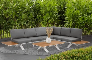 Narożnik ogrodowy SORRENTO WOOD White - Meble ogrodowe klasy premium, narożnik ogrodowy Sorrento to solidny, aluminiowy stelaż odporny na większość typowych czynników zewnętrznych. Dzięki temu narożnik Sorrento stanowi nie tylko funkcjonalną ozdobę ogrodu, ale też świetne wyposażenie dla restauracji czy hotelu. Meble przez niezwykle długi czas prezentują się jak nowe - i co równie istotne, zachowują wszystkie zalety praktyczne. Jako że narożnik ogrodowy Sorrento składa się z dwóch łączonych modułów, równie dobrze można zrobić z niego dwie odrębne, trzyosobowe sofy. Na szczególną uwagę zasługują również wydłużone końce, dodatkowe półki z aluminium - w ten sposób narożnik Sorrento zyskuje podręczne podstawki, np.