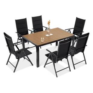 Zestaw SYDNEY w kolorze dark grey / teak to doskonały wybór dla osób ceniących nowoczesny design, wygodę i trwałość. Ten 7-elementowy komplet został zaprojektowany z myślą o maksymalnym komforcie użytkowania oraz odporności na zmienne warunki atmosferyczne. Dzięki ergonomicznej konstrukcji, solidnym materiałom oraz estetycznemu wykończeniu, idealnie sprawdzi się zarówno w ogrodzie, na tarasie, jak i na większym balkonie. Zestaw mebli ogrodowych SYDNEY dark grey / teak to nowoczesny styl i niezrównany komfort. Cechy produktu komplet dla 6 osób – w skład zestawu wchodzi duży, prostokątny stół oraz 6 wygodnych, pozycjonowanych krzeseł wytrzymała konstrukcja – rama wykonana z wysokiej jakości aluminium malowanego proszkowo, odporna na korozję i niekorzystne warunki atmosferyczne komfortowe krzesła – regulowane oparcia z 8-stopniową możliwością ustawienia pozwalają na dopasowanie pozycji do indywidualnych preferencji użytkownika trwałe siedziska i oparcia – zastosowana tkanina textiline z watoliną zapewnia wygodę i odporność na promieniowanie UV nowoczesny stół z blatem kompozytowym – powierzchnia wykonana z materiału „polywood” doskonale imituje drewno, jest wodoodporna i niewymagająca konserwacji stabilność i regulacja – przemyślana konstrukcja stołu oraz regulowane nóżki gwarantują idealne wypoziomowanie nawet na nierównym podłożu składane krzesła – możliwość ich złożenia pozwala na łatwe przechowywanie i oszczędność miejsca łatwa pielęgnacja – zestaw jest prosty w utrzymaniu czystości, odporny na zabrudzenia i przystosowany do całorocznego użytkowania na świeżym powietrzu Wymiarykrzesło:
