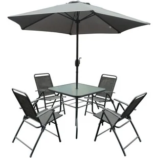Zapewnij odrobinę luksusu sobie, Twojej rodzinie i przyjaciołom podczas przyjęć lub spotkań przy grillu. Zestaw posiada 4 wygodne, składane krzesła i elegancki stół z blatem z hartowanego szkła falistego o grubości 5 mm oraz szeroki na ok.250 cm (średnica rozłożonego parasola) i rozkładany parasol, który ochroni Ciebie i Twoich gości przed prażącym słońcem. Krzesła w każdej chwili możesz złożyć, co będzie przydatne np. podczas koszenia trawy.