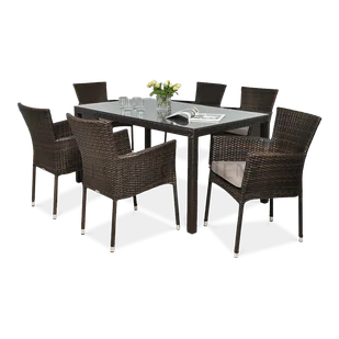 Zestaw Mebli Ogrodowych Tarasowych LERIDA/VENECJA Zestaw Jadalniany Technorattan LERIDA/VENECJA 6+1 Brown 002055 Opis: Zestaw Jadalny LERIDA/VENECJA 6+1 Technorattan to świetny zestaw jadalny dla sześciu osób. Jego nowoczesny design, solidna konstrukcja i wygodne siedzisko sprawiają, że jest to doskonały wybór do Twojego domu. Jego atrakcyjny rattanowy splot i niepowtarzalny design dodadzą charakteru Twojej przestrzeni, a jego wydajność i styl sprawią, że będzie popularnym wyborem na patio i ogród. Cechy: w skład kompletu wchodzi 6 wygodnych krzeseł z poduszkami oraz duży, efektowny stół krzesła wykonane z aluminium malowanego proszkowo a rama stołu z mocnej i wytrzymałej stali do jego wykończenia użyto wysokiej jakości technorattanu w efektownym odcieniu brązu, bardzo ładny efekt! krzesła są dodatkowo sztaplowane (składane jedno w drugie) co zaoszczędza miejsca oraz ułatwia ich przechowywanie o dodatkowy komfort dbają wygodne poduszki na siedziskach z zamkiem błyskawicznym charakter stołu podkreśla ozdobny wyplot widoczny pod blatem z hartowanego szkła, BARDZO ŁADNY EFEKT! aluminiowe zakończenia nóg zapobiegają rozwarstwieniu się wyplotu oraz podkreślają eleganckie wykończenie dzięki użyciu materiałów najwyższej jakości, komplet oznacza się maksymalną trwałością, odpornością na warunki atmosferyczne i promieniowanie UV krzesła są od razu gotowe do użycia, natomiast stół przeznaczony jest do prostego, samodzielnego montażu wg załączonej instrukcji zestaw nadaje się do użytku zewnętrznego i wewnętrznego (hotele, restauracje, kawiarnie, ogród, taras, salon, jadalnia) Wymiary: