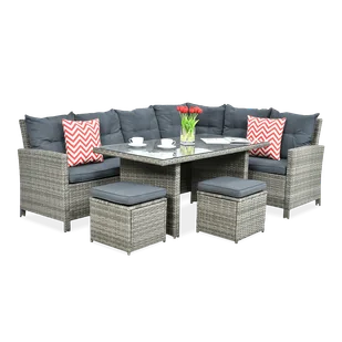 Narożnik z technorattanu IBIZA Grey - Lubisz spędzać letnie popołudnia w ogrodzie? Ponad wszystko cenisz sobie elegancję, wygodę i komfort wypoczynku? Narożnik z technorattanu IBIZA Grey idealnie wkomponuje się w naturalne otoczenie i spełni wszystkie Twoje oczekiwania! Stelaż kompletu wykonano z mocnej stali, a cała konstrukcja opleciona jest wysokiej jakości technorattanem – trwałym, odpornym na szkodliwy wpływ czynników zewnętrznych. Zestaw mebli ogrodowych IBIZA może pełnić zarówno funkcję wypoczynkową, jak i jadalnianą: składa się z 2 głównych modułów stanowiących właściwy narożnik, 2 puf oraz dużego stołu jadalnianego pokrytego hartowanym szkłem o grubości 5 mm. O wygodę zadbają miękkie, praktyczne poduszki oparciowe i siedziskowe – ich pokrycie jest zdejmowane, co zdecydowanie ułatwia czyszczenie – wystarczy odpiąć pokrowiec i uprać w pralce. Technorattan i stal wykorzystane do wykonania zestawu cechują się niezwykłą odpornością: