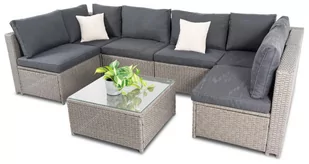 Zostały wykonane z wysokiej jakości plecionki z technorattanu osadzonej na metalowej ramie. Moduły wyposażone są w miękkie i wygodne poduchy. Kolorystyka zestawu jest szaro-grafitowa. Cały zestaw nada wnętrzom nowoczesnego i minimalistycznego charakteru. W gratisie do zestawu mebli dołączono dwa miękkie szare koce polarowe, które przydadzą się w nieco chłodniejsze wieczory oraz dwie małe poduszki ozdobne w jasnym kolorze.