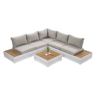 Aluminium zapewnia trwałość i łatwość przenoszenia mebli, a malowanie proszkowe chroni przed korozją. Dzięki zastosowanym materiałom, meble są odporne na działanie niekorzystnych warunków atmosferycznych, co zwiększa ich żywotność. Polywood, imitujący drewno tekowe, dodaje zestawowi naturalnego wyrazu, co nadaje meblom elegancki i przytulny wygląd. Biała konstrukcja z dodatkami w kolorze teak oraz poduszki w złamanej bieli pomieszanej z szarością tworzą harmonijną i estetyczną kompozycję. WymiaryModuł lewy: