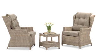 Zestaw wypoczynkowy TRIVENTO DUO Beige - Szukasz idealnego kompletu mebli ogrodowych dla dwojga? Ten zestaw z całą pewnością jest godny uwagi! Trivento Duo Beige to komplet składający się z dwóch bardzo komfortowych foteli i niewielkiego stolika. Idealnie sprawdzi się podczas porannej kawy, popołudniowej herbaty czy długich wieczornych rozmów. Miękkie i przepastne fotele utrzymane w klasycznym stylu zapewniają wyjątkowy komfort, a jednocześnie dodają klasy kącikowi wypoczynkowemu w Twoim ogrodzie, na tarasie lub balkonie. Meble prezentują się wręcz wytwornie, zachęcając do spędzenia chociaż kilku chwil na świeżym powietrzu. Zestaw mebli ogrodowych Trivento Duo Beige wykonano z praktycznego i estetycznego technorattanu.