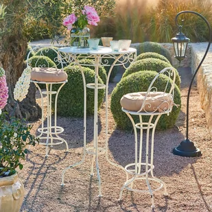 Autentyczny francuski styl. O lekkim, uroczym charakterze. Z żelaza o antycznym wykończeniu. Pasujące poduszki należy zamawiać oddzielnie. Très charmant, czyż nie? Urocze trio przywodzące na myśl klimatyczne francuskie bistro zawiera ażurowy stolik oraz dwa pasujące do niego krzesła.