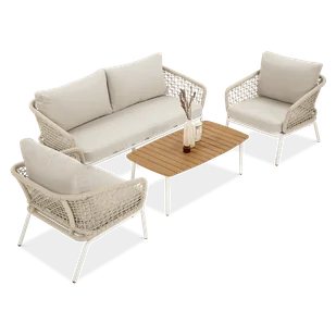 Jego konstrukcja została wykonana z aluminium i gwarantuje trwałość oraz odporność na warunki atmosferyczne. Blat stołu wykonany z polywood o grubości 1,5 cm prezentuje się nie tylko stylowo, ale również jest łatwy do utrzymania w czystości. Komplet ogrodowy Furrore ROMA CAFFE Light Beige to połączenie stylu, komfortu i jakości. Cechy produktu Konstrukcja wykonana z odpornego na korozję aluminium opleciona sznurem Blat stolika wykonany z materiału polywood Blat stołu ma grubość 15mm Grubość poduszek siedziska to 10cm a oparcia 18 cm Wysokość siedziska sofy i foteli to 32cm Materiał z jakiego wykonane są poszewki poduszek to poliester przędzony i olefin Poduszki są wypełnione pianką i włóknem Poszewki poduszek wyposażone są w zamki błyskawiczne, co znacznie ułatwi utrzymanie ich w czystościWymiary Sofa: szerokość - 173,5 cm, głębokość - 80 cm, wysokość - 70 cm Fotel: