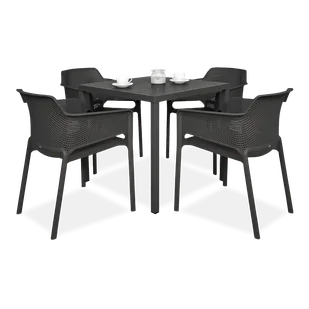 Zestaw Nardi NET/CUBE 80 4+1 Antracite - Meble ogrodowe NET/CUBE 4+1 Antracite to nowoczesny komplet jadalniany, którego autorem jest znany i ceniony producent mebli ogrodowych premium - marka Nardi. Te meble do restauracji i ogrodu zaprojektowane zostały zarówno z myślą o najbardziej wymagającym kliencie segmentu HoReCa (hotele, kawiarnie, ogródki gastronomiczne) jak i również kliencie detalicznym, który oczekuje po prostu najwyższej jakości. Mamy tu więc najlepsze materiały w postaci 100% polipropylenu wzmacnianego włóknem szklanym i aluminium, modne kolory, nowoczesny i jednocześnie uniwersalny design oraz wytrzymałość na najwyższym możliwym poziomie. Przewaga mebli ogrodowych Nardi nad innymi jest m. in. taka, że nie wymagają żadnych zabiegów konserwacyjnych, są odporne na śnieg, mróz, deszcz i słońce, generalnie mogą stać na dworze przez cały okrągły rok.