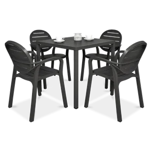 Zestaw Nardi PALMA/CUBE 80 4+1 Antracite - Meble ogrodowe PALMA/CUBE 4+1 Antracite to nowoczesny komplet jadalniany, którego autorem jest znany i ceniony producent mebli ogrodowych premium - marka Nardi. Te meble do restauracji i ogrodu zaprojektowane zostały zarówno z myślą o najbardziej wymagającym kliencie segmentu HoReCa (hotele, kawiarnie, ogródki gastronomiczne) jak i również kliencie detalicznym, który oczekuje po prostu najwyższej jakości. Mamy tu więc najlepsze materiały w postaci 100% polipropylenu wzmacnianego włóknem szklanym i aluminium, modne kolory, nowoczesny i jednocześnie uniwersalny design oraz wytrzymałość na najwyższym możliwym poziomie. Przewaga mebli ogrodowych Nardi nad innymi jest m. in. taka, że nie wymagają żadnych zabiegów konserwacyjnych, są odporne na śnieg, mróz, deszcz i słońce, generalnie mogą stać na dworze przez cały okrągły rok.