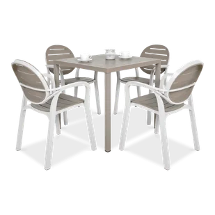 Zestaw Nardi PALMA/CUBE 80 4+1 Bianco Tortora - Meble ogrodowe PALMA/CUBE 4+1 Bianco Tortora to nowoczesny komplet jadalniany, którego autorem jest znany i ceniony producent mebli ogrodowych premium - marka Nardi. Te meble do restauracji i ogrodu zaprojektowane zostały zarówno z myślą o najbardziej wymagającym kliencie segmentu HoReCa (hotele, kawiarnie, ogródki gastronomiczne) jak i również kliencie detalicznym, który oczekuje po prostu najwyższej jakości. Mamy tu więc najlepsze materiały w postaci 100% polipropylenu wzmacnianego włóknem szklanym i aluminium, modne kolory, nowoczesny i jednocześnie uniwersalny design oraz wytrzymałość na najwyższym możliwym poziomie. Przewaga mebli ogrodowych Nardi nad innymi jest m. in. taka, że nie wymagają żadnych zabiegów konserwacyjnych, są odporne na śnieg, mróz, deszcz i słońce, generalnie mogą stać na dworze przez cały okrągły rok.