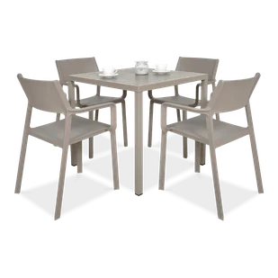 Zestaw Nardi TRILL/CUBE 80 4+1 Tortora - Meble ogrodowe TRILL/CUBE 4+1 Tortora to nowoczesny komplet jadalniany, którego autorem jest znany i ceniony producent mebli ogrodowych premium - marka Nardi. Te meble do restauracji i ogrodu zaprojektowane zostały zarówno z myślą o najbardziej wymagającym kliencie segmentu HoReCa (hotele, kawiarnie, ogródki gastronomiczne) jak i również kliencie detalicznym, który oczekuje po prostu najwyższej jakości. Mamy tu więc najlepsze materiały w postaci 100% polipropylenu wzmacnianego włóknem szklanym i aluminium, modne kolory, nowoczesny i jednocześnie uniwersalny design oraz wytrzymałość na najwyższym możliwym poziomie. Przewaga mebli ogrodowych Nardi nad innymi jest m. in. taka, że nie wymagają żadnych zabiegów konserwacyjnych, są odporne na śnieg, mróz, deszcz i słońce, generalnie mogą stać na dworze przez cały okrągły rok.