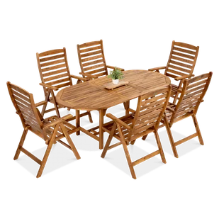 Dodatkowo warto też meble zabezpieczyć pokrowcem. Dzięki takiej ochronie masz gwarancję, że meble nie ulegną zniszczeniu czy uszkodzeniu. Cechy: zestaw składa się z 6 pozycyjnych krzeseł oraz dużego, owalnego stołu wykonany jest z twardego drewna akacjowego, które cechuje wysoka trwałość, gęstość i odporność na warunki atmosferyczne krzesła są pełni składane, dzięki czemu po złożeniu zajmują mało miejsca oparcia posiadają 6 stopniową regulację, która umożliwia dopasowanie ich do indywidualnych preferencji stół wyposażony jest w bardzo wygodny system składania/rozkładania w zakresie 150-190cm, dodatkowo posiada otwór na parasol od spodu stołu znajdują się metalowe zaczepy zabezpieczające przed przypadkowym rozłożeniem stołu odpowiedni kształt i grube profile zapewniają solidność i stabilność zestawu całość charakteryzuję się estetycznym wykończeniem i wysoką jakością wykonania krzesła wysyłane są w całości, natomiast stół przeznaczony jest do prostego, samodzielnego montażu wg załączonej instrukcji Wymiary: krzesło: szerokość - 62 cm, głębokość - 66 cm, wysokość - 110 cm, maks. obciążenie - 150 kg stół rozłożony: