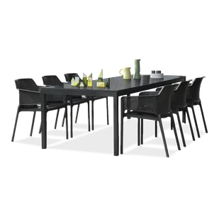 Zestaw ogrodowy Nardi NET/RIO - 6/140 Antracite - Wieloelementowy zestaw wygodnych mebli ogrodowych renomowanej, włoskiej marki Nardi. Krzesła Net oraz stół Rio cechuje bardzo wysoka jakość, dzięki czemu bardzo dobrze się uzupełniają. Zestaw Nardi Net/Rio Antracite przypadnie do gustu zarówno miłośnikom niebanalnego wzornictwa, jak również osobom które w pierwszej kolejności cenią sobie funkcjonalność. Za sprawą swoich widocznych zalet, a także poziomu technicznego wykonania, dostępne w sklepie FocusGarden meble okazują się idealnym wyborem w wielu różnych sytuacjach. Komplet składa się z 6 sztaplowanych krzeseł Nardi Net oraz dużego, łatwo i szybko rozkładanego stołu Nardi Rio 140.