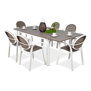 Zestaw ogrodowy Nardi PALMA/ALLORO - 8/210 Bianco Tortora - Cenisz sobie komfort własny i Twoich gości, gustujesz we włoskiej stylistyce, a do tego oczekujesz że meble będą Ci służyć przez wiele długich lat? W takim razie zestaw ogrodowy Nardi Palma/Alloro Bianco Tortora spełni wszystkie Twoje wymagania! Wygoda użytkowania mebli bierze się z odpowiedniego ich wyprofilowania, wykorzystania wysokośćokiej jakości materiałów oraz wielu przydatnych funkcjonalności. Wszystkie elementy zestawu - 8 krzeseł Nardi Palma plus rozkładany, prostokątny stół Nardi Alloro 210 - powstają z polipropylenu i malowanego proszkowo aluminium. Taki skład zapewnia im maksymalną odporność na opady, skrajne temperatury czy promienie słoneczne, ponadto zestaw Nardi Palma/Alloro Bianco Tortora w ogóle nie wymaga specjalistycznej konserwacji, żeby utrzymać oryginalną, biało-brązową kolorystykę. Piękny wygląd mebli wynika także z ich oryginalnej linii: delikatne zaokrąglenia krawędzi stołu świetnie współgrają z kolistymi oparciami krzeseł.