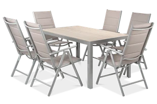 komplet składa się z 6 pozycjonowanych krzeseł oraz dużego, prostokątnego stołu konstrukcja wykonana jest z najwyższej jakości aluminium malowanego proszkowo, dzięki czemu jest całkowicie odporna na rdzę i niekorzystne warunki atmosferyczne siedziska i oparcia krzeseł tapicerowane są mocną, dwustronną tkaniną textiline wypełnioną watoliną. Takie optymalne rozwiązanie zapewnia wyjątkowy komfort siedzenia oraz wytrzymałość na promieniowanie UV blat stołu to wodoodporna deska kompozytowa „polywood” która z jednej strony doskonale imituje naturalne drewno, a z drugiej jest całkowicie odporna na śnieg, deszcz i promieniowanie słoneczne. Nie wymaga tym samym żadnej konserwacji nowocześnie zaprojektowana konstrukcja stołu (kształt profili i sposób ich montowania) powodują, że całość jest wyjątkowo stabilna. Dodatkowo, nogi wyposażone są w regulację zapewniającą właściwe wypoziomowanie stołu na nierównej powierzchni nasze krzesła posiadają 8-stopniową regulację oparcia umożliwiającą dopasowanie ich do indywidualnych upodobań. Przy najniższym położeniu są wygodny niczym leżaki ogrodowe! krzesła są również w pełni składane co pozwala zaoszczędzić miejsca oraz ułatwia ich przechowywanie zestaw jest bardzo łatwy do utrzymania w czystości i doskonale sprawdza się w codziennym użytkowaniu.