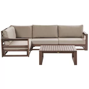 Modułowy zestaw mebli wypoczynkowych. Ten praktyczny zestaw ogrodowy wyróżnia się eleganckim, a zarazem nowoczesnym designem. Mebel wykonany został z najwyższej jakości, wytrzymałego i prostego w pielęgnacji drewna akacjowego z certyfikatem FSC. Narożnik złożony jest z elementów modułowych, które mogą być aranżowane na różne sposoby lub posłużyć jako osobne siedziska. Zestaw ogrodowy zachwyca doskonałą kombinacjąramy w ciemnobrązowym odcieniu z beżowoszarym kolorem miękkich poduszek.