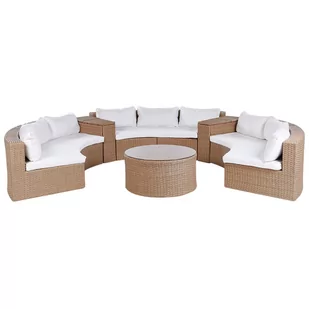 Ten półokrągły zestaw wypoczynkowy w kształcie litery U stworzy uroczy zakątek w każdym ogrodzie lub na tarasie. Wykonany z wysokiej jakości technorattanu, składa się z dziewięciu elementów, oferując maksymalny komfort, a także funkcjonalność i stylowy wygląd. Zestaw zawiera sześć modułów do siedzenia o zaokrąglonym kształcie. Każdy z nich jest wyposażony w miękkie poduszki ze zdejmowaną poszewką. W skład zestawu wchodzą również pojemne skrzynie, które rozdzielają poszczególne siedziska.