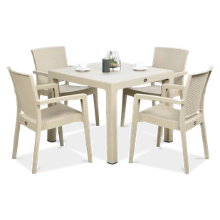 Zestaw restauracyjny Novussi ZENIT 4+1 Cappuccino - Postaw na meble ogrodowe, które posłużą Ci na dłużej. Jeśli masz dość produktów, które po jednym lub dwóch sezonach są do wyrzucenia, koniecznie zwróć uwagę na jadalniany zestaw Zenit 4 z estetycznego tworzywa wzmocnionego włóknem szklanym. Jest niezwykle solidny i wytrzymały – stół testowano przy obciążeniach sięgających 1300 kg! Ten komplet składający się z kwadratowego stołu i 4 krzeseł jest przeznaczony dla najbardziej wymagających użytkowników – przede wszystkim branży HoReCa, ale również osób prywatnych chcących wyposażyć swój ogród lub taras w niezniszczalny zestaw mebli ogrodowych. Stylowy zestaw ogrodowy Zenit 4 w kolorze cappuccino będzie stanowić świetną ozdobę Twojej przestrzeni. Może być bez obaw użytkowany na zewnątrz przez cały rok, ponieważ jest bardzo odporny na czynniki atmosferyczne, w tym na promieniowanie UV, wysokie i niskie temperatury oraz wilgoć.