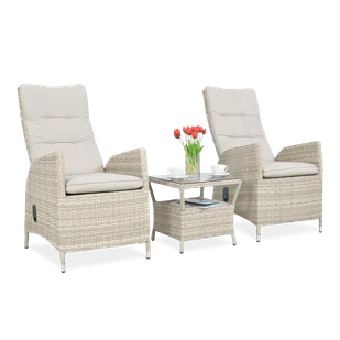 Zestaw wypoczynkowy MALTA DUO BeigeFocus Garden Dwuosobowy zestaw Malta Duo Beige to niezwykle wygodny i funkcjonalny komplet wypoczynkowy dla 2 osób, składający się z 3 elementów. Fotele wyposażone są w wysokie oparcia, które dodatkowo posiadają płynną, hydrauliczną regulację kąta nachylenia zapewniając maksymalny relaks i odpoczynek. Uzupełnieniem całości jest zgrabny stolik kawowy ze szklanym blatem oraz dolną półką - na przykład na książki, gazety lub cokolwiek innego, co warto mieć pod ręką podczas ogrodowego relaksu. Wszystkie meble bazują na trwałej, stabilnej konstrukcji ze stali, a całość wykończono plecionką technorattanową w kolorze beżowym. Zarówno fotele, jak i stolik z zestawu wypoczynkowego Malta Duo utrzymane są w jednorodnej, modnej stylistyce.