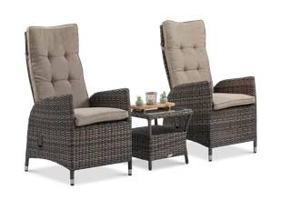 - zestaw przeznaczony jest do użytku zewnętrznego i wewnętrznego - w skład zestawu wchodzą 2 wygodne fotele z regulacją oparcia i funkcjonalny stolik kawowy - stelaż wykonany jest z wytrzymałej i solidnej stali, która zapewnia należytą sztywność konstrukcji - do wykończenia użyty został najwyższej jakości technorattan w odcieniu brązowym - fotele posiadają bezstopniowe regulowane oparcie, mechanizm można odblokować podnosząc dźwignię do góry - komfort wypoczynku dopełnia bardzo wygodna poduszka na siedzisku i oparciu - odpowiednio profilowane, wysokie oparcia odznaczają się dużym komfortem siedzenia - zastosowane materiały zapewniają wysoką odporność na warunki atmosferyczne i promieniowanie UV - całość jest bardzo łatwa do utrzymania w czystości, do pielęgnacji wystarczy tylko wilgotna ściereczka Wymiary: