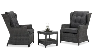 Zestaw wypoczynkowy TRIVENTO DUO Dark Grey - Szukasz idealnego kompletu mebli ogrodowych dla dwojga? Ten zestaw z całą pewnością jest godny uwagi! Trivento Duo Dark Grey to komplet składający się z dwóch bardzo komfortowych foteli i niewielkiego stolika. Idealnie sprawdzi się podczas porannej kawy, popołudniowej herbaty czy długich wieczornych rozmów. Miękkie i przepastne fotele utrzymane w klasycznym stylu zapewniają wyjątkowy komfort, a jednocześnie dodają klasy kącikowi wypoczynkowemu w Twoim ogrodzie, na tarasie lub balkonie. Meble prezentują się wręcz wytwornie, zachęcając do spędzenia chociaż kilku chwil na świeżym powietrzu. Zestaw mebli ogrodowych Trivento Duo Dark Grey wykonano z praktycznego i estetycznego technorattanu.