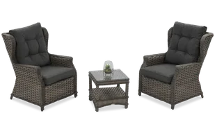 Cechy produktu zestaw wypoczynkowych mebli ogrodowych z technorattanu skład zestawu: 2 fotele, mały stolik kawowy z grubym blatem ze szkła hartowanego kolor: melange konstrukcja oparta na aluminiowym stelażu – lekka, wytrzymała i odporna na rdzę grube, odporne na odkształcenia poduszki na siedziskach i oparciach – ze zdejmowanym pokryciem ułatwiającym czyszczenie wysokie, profilowane oparcia foteli – wyjątkowy komfort odpoczynku komplet odporny na warunki atmosferyczne – promieniowanie UV, wilgoć, opady, wysokie i niskie temperaturyWymiary fotel: szerokość - 73 cm, głębokość - 89 cm, wysokość - 98 cm stolik: długość - 40 cm, szerokość - 40 cm, wysokość - 42 cm