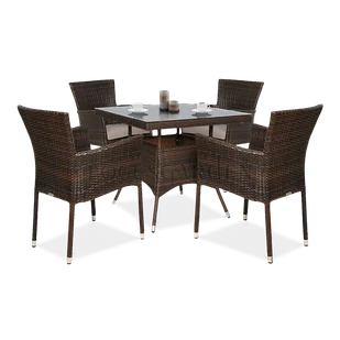 Zestaw z Technorattanu LERIDA/LUGO 4+1 Brown Zestaw z Technorattanu LERIDA/LUGO 4+1 Brown 001252 Opis: Zestaw rattanowy LERIDA/LUGO 4+1 to stylowy i wygodny zestaw, który doskonale sprawdzi się w ogrodach i na tarasach. Połączenie aluminium i rattanu sprawia, że jest odporny na każdą pogodę, dlatego doskonale sprawdzi się w restauracjach i kawiarniach, a także w Twoim domu. Zestaw również wygląda świetnie, więc będzie popularnym wyborem wśród gości, bywalców restauracji i właścicieli domów. Cechy: w skład kompletu wchodzą 4 wygodne krzesła z poduszkami oraz funkcjonalny, kwadratowy stół zestaw wykonany jest w całości z aluminium, dzięki czemu jest solidny i całkowicie odporny na rdzę do jego wykończenia użyto wysokiej jakości technorattanu w efektownym odcieniu brązu, bardzo ładny efekt! krzesła są dodatkowo sztaplowane (składane jedno w drugie) co zaoszczędza miejsca oraz ułatwia ich przechowywanie o dodatkowy komfort dbają wygodne poduszki na siedziskach z zamkiem błyskawicznym aluminiowe zakończenia nóg zapobiegają rozwarstwieniu się wyplotu oraz podkreślają eleganckie wykończenie blat stołu wykonany jest z bardzo wytrzymałej, hartowanej szyby dzięki użyciu materiałów najwyższej jakości, komplet oznacza się maksymalną trwałością, odpornością na warunki atmosferyczne i promieniowanie UV krzesła są od razu gotowe do użycia, natomiast stół przeznaczony jest do prostego, samodzielnego montażu wg załączonej instrukcji zestaw nadaje się do użytku zewnętrznego i wewnętrznego (hotele, restauracje, kawiarnie, ogród, taras, salon, jadalnia) Wymiary: