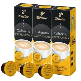 ZESTAW TCHIBO CAFISSIMO CAFFE CREMA MILD 10 KAPSUŁEK X3 Tchibo Cafissimo Caffe Crema Mild 10 kapsułek Tchibo Cafissimo Crema Fine Aroma (dawne - Caffe Crema Mild) – to łagodnie wypalona mieszanka 100% arabiki. Cechuje ją delikatny smak, zrównoważona aromatyczność o owocowych nutach. Crema Fine uwieńczona złocistą pianką to świetny wybór dla lubiących łagodny smak czarnej kawy. Łagodny smak pianki Crema z delikatną owocową nutą do ekspresów Cafissimo DOKŁADNE INFORMACJE: Producent: Tchibo Typ kawy: