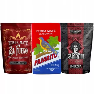 Zestaw yerba mate El Fuego Energia guarana 500 g Pajarito Elaborada 500 g Guarani Energia guarana 500 g El Fuego Energia Guarana 500 g Yerba mate El Fuego pochodzi z plantacji położonej w departamencie Itapúa, położonym przy granicy z Argentyną. Do produkcji trafiają wyłącznie najlepsze, selekcjonowane listki i gałązki ostrokrzewu paragwajskiego, pełne witamin i minerałów, które po obróbce charakteryzują się wyjątkowym, głębokim, dymnym aromatem. Dymna, pylasta, intensywna w smaku, cierpko-gorzka, mocno pobudzająca. Kwintesencja paragwajskiej yerba mate. El Fuego to gratka dla prawdziwych koneserów, którym nie straszny jest smak gorzkiej, wytrawnej yerby, wędzonej drzewnym dymem.