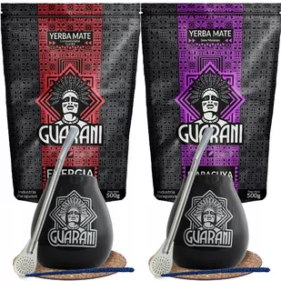 Skład zestawu: Guarani Energia con Guarana 500 g Guarani Maracuya 500 g 2x Tykwa ceramiczna 2x Bombilla Mercedes 2x Podkładka korkowa 2x Czyścik do bombilli Sposób przygotowania: zalać wodą o temperaturze nie większej niż 80°C. Masa netto: 2x 500 g Sposób przechowywania: