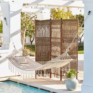 Idealny klimat południa w Twoim ogrodzie! Z wsuwanymi drewnianymi prętami i stabilnym mocowaniem. Cudownie miękki i relaksujący sposób na spędzanie czasu. Rozłóż się wygodnie między dwoma drzewami i pomarz o ciepłym, południowym morzu. Drewniane listwy u góry i u dołu zapobiegają zapadaniu się hamaka, zwiększając tym samym komfort leżenia. Wiązane frędzle podkreślają południowy charakter, a solidne pętle do zawieszania zapewniają bezpieczeństwo.