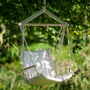 Krzesło brazylijskie w kolorze ecru jest doskonałą alternatywą dla tradycyjnego hamaka, a równie przyjemnie można się na nim zrelaksować. Jest idealnym miejscem do odpoczynku, czytania książki czy popijania kawy. Krzesło wyposażone w drewniane podłokietniki, które zapewniają dodatkową wygodę. Dzięki niewielkim wymiarom można zawiesić je w pomieszczeniach, na balkonie, jak również w ogrodzie. Krzesło brazylijskie łatwo się składa i nie zajmuje wiele miejsca, przez co jest proste w transporcie oraz w przechowywaniu.