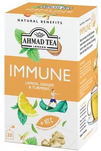 Ahmad Tea Immune Health Benefit napar imbir kurkuma 20 torebek aluminiowych PRODUKT NATURALNY, WYSOKIEJ JAKOŚCI Napar immunologiczny pomaga utrzymać się na szczycie dzięki regenerującej mieszance imbiru, kurkumy, trawy cytrynowej i witaminy C. Daj swojemu układowi odpornościowemu trochę miłości dzięki tej stymulującej herbacie owocowo ziołowej. Do tego egzotycznego naparu Mistrzowie Herbaty tworzą mocną bazę pokrzyw i korzenia lukrecji. Są idealnym tłem dla orzeźwiających nut trawy cytrynowej, ognistego imbiru i rozgrzewającej kurkumy. Aby uzupełnić mieszankę, dodajemy naturalną witaminę C.