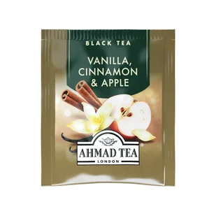 Ahmad Tea Vanilla, Cinnamon & Apple 500tbx2g koperta alu Ta wyjątkowa czarna herbata to połączenie rozgrzewającego i otulającego aromatu w każdej filiżance. Idealna na chłodniejsze dni lub wtedy, gdy masz ochotę na chwilę relaksu, łączy pełny smak czarnej herbaty z delikatną słodyczą wanilii, korzenną nutą cynamonu i świeżością jabłka. Najwyższa jakość składników: starannie wyselekcjonowana czarna herbata z dodatkiem wanilii, cynamonu i soczystego jabłka daje idealną równowagę smaków: harmonijne połączenie słodko-korzennego smaku, które otula i rozgrzewa.