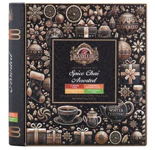 Świąteczny zestaw herbat cejlońskich z dodatkami. Zanurz się w zniewalających smakach Basilur Spice Chai Assorted - zestawie czterech aromatycznych herbat, zamkniętych w eleganckiej puszce w kształcie książki. Połączenie pełnego smaku cejlońskiego naparu z korzennymi nutami otuli Cię i rozgrzeje Twoje serce. Idealne na pełne ciepła chwile z bliskimi. Każda filiżanka to inny rozdział tej pachnącej historii: