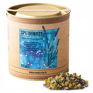 DWORZYSK - ŚPIJ DOBRZE - Duże opakowanie Składniki: kwiat lawendy 37%, kwiat rumianku, liść melisy, kwiat wrzosu, szyszki chmielu Pojemność: 60g Mieszanka zi...