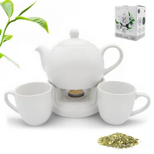 Dzbanek 2 Kubki Z Podgrzewaczem Biały Imbryk Kamionka Herbata 1L